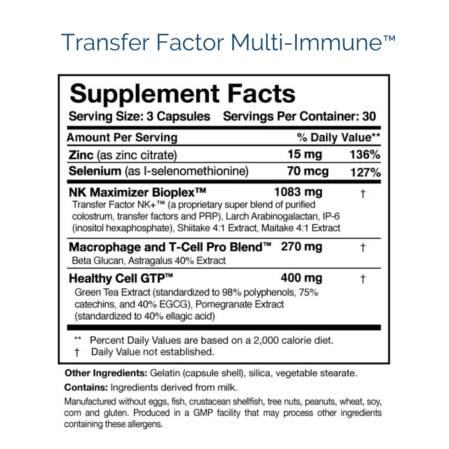 Transfer Factor NK+™ (a proprietary super blend of purified colostrum, transfer factors and PRP), Larch Arabinogalactan, IP-6 (inositol hexaphosphate), Shiitake 4:1 Extract, Maitake 4:1 Extract